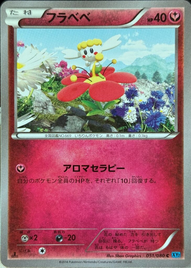 This Flabébé is a 1st Edition Common card from the Japanese set Wild Blaze (XY2). While Commons are the most frequent cards in a set, the 1st Edition stamp marks this as a lovely artefact from the initial 2014 print run, adding a touch of historical value. This card is also the first stage in the evolutionary line of the Florges we previously catalogued.