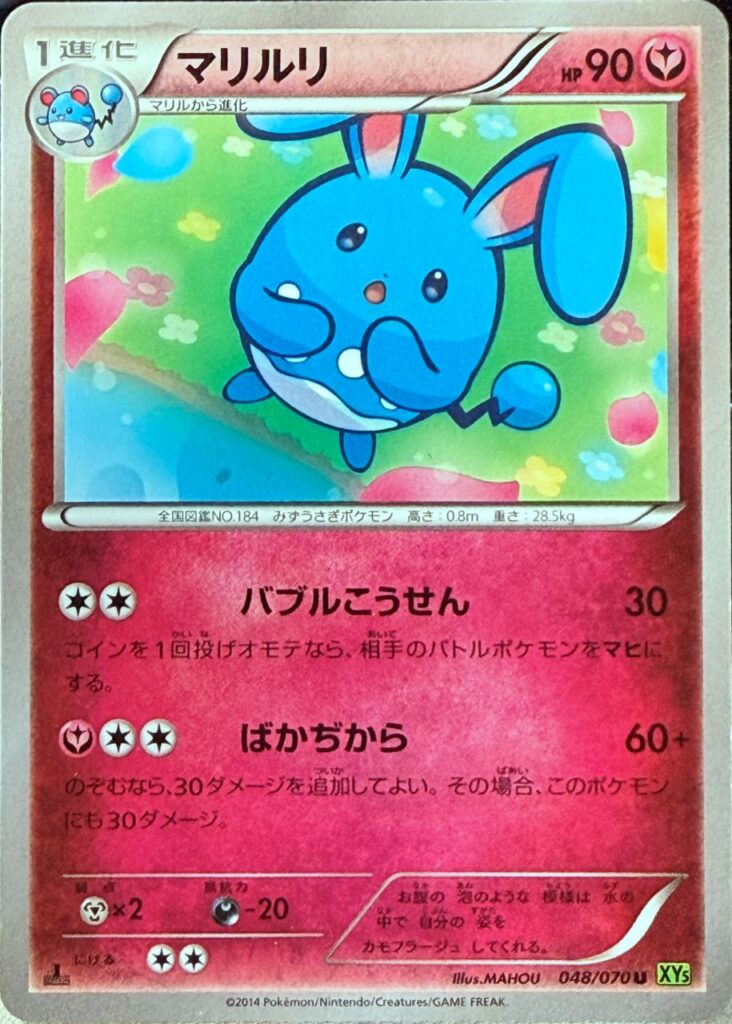 This Azumarill is a 1st Edition Uncommon card from the Japanese set Tidal Storm (XY5). As the direct evolution of the Marill we previously catalogued, it forms a lovely pair from the initial 2014 print run of this XY-era set. The “Uncommon” rarity (marked by a diamond symbol in some sets, but just by its card number here) sits between Common and Rare.