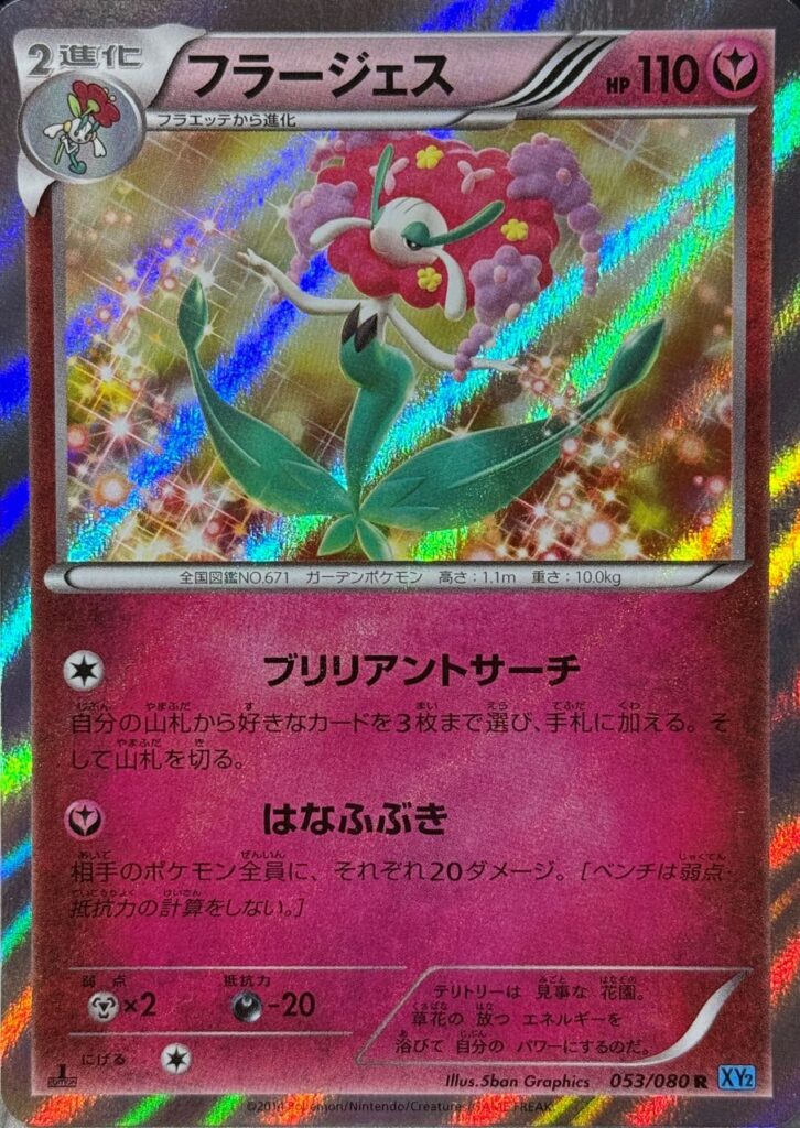 This Florges is a 1st Edition Holo Rare from the Japanese set Wild Blaze (XY2), which was also home to the Carbink we catalogued earlier. Its 1st Edition stamp confirms it as a piece from the set’s initial 2014 print run. The card is brought to life by a dazzling “cosmos” holographic pattern that makes the background sparkle brilliantly, a perfect match for this radiant Pokémon.