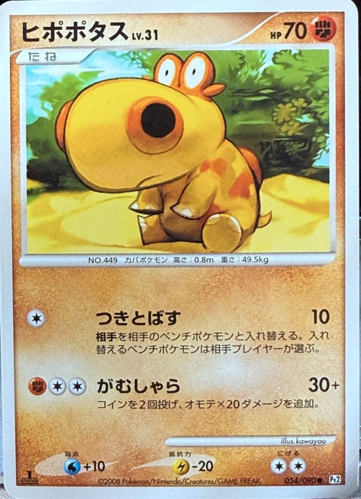 Our next entry is the pre-evolution of the mighty Hippowdon, the sand-loving Hippopotas. This 1st Edition card from the Diamond & Pearl era set Shining Darkness is a charming and thematically vital member of the “Friends of Geopik.”